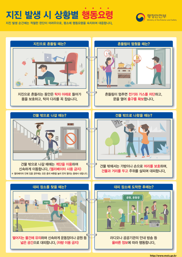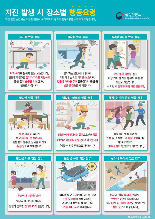 지진 발생 시 상황별, 장소별 행동요령 안내
