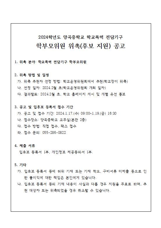 2024. 학교폭력 전담기구 구성을 학부모위원 위촉(후보 지원)을 아래와 같이 공고하오니 참고하시기 바랍니다.
